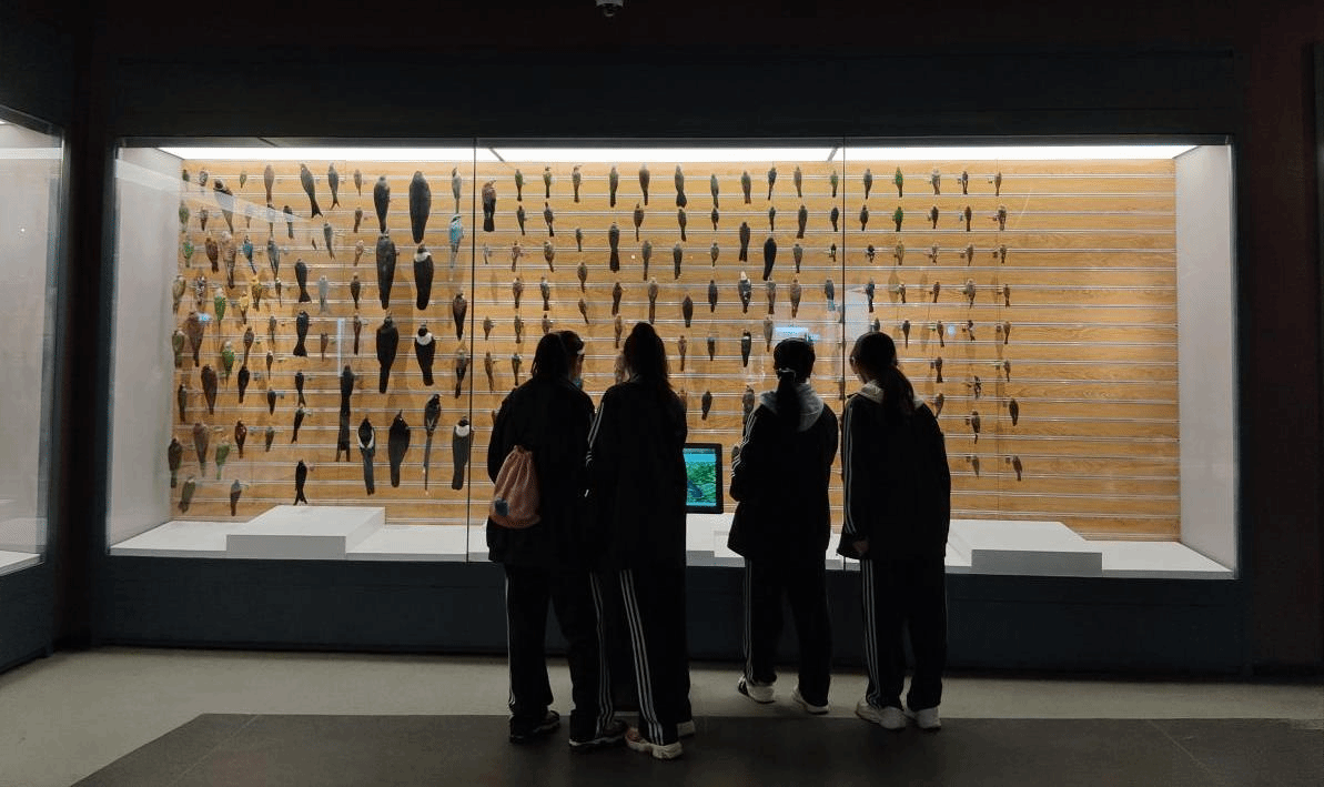 随后,师生一起进入生科博物馆参观。生科博物馆内有三名讲解员,对植物展区和动物展区都进行了较为详细的解说。各种生物的标本抓住了学生们的眼球,学生们也对古生物进化过程十分感兴趣。在讲解员的引导下不少学生提出了自己的问题,同时也在观察中思考,在交流互动中对于生物学有更近一步理解;在沉浸式VR体验时,学生们积极尝试其中的项目,化身"自然探险家",在虚拟仿真的自然世界中畅游。