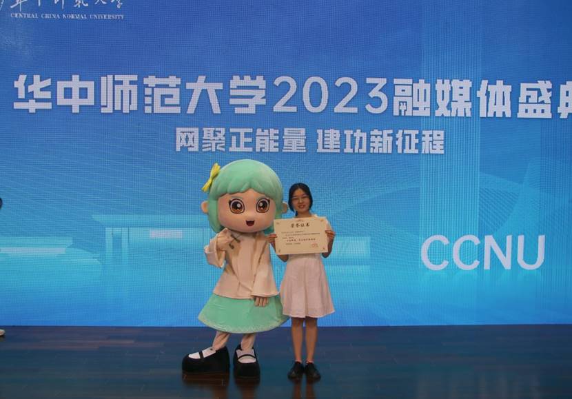 图为学生代表上台领奖并与学院融媒体形象互动