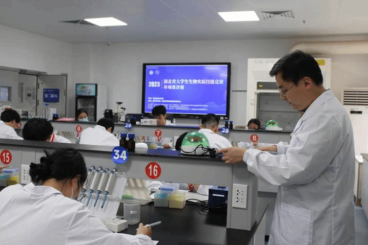 华大生科讯(通讯员/王洪 摄影/陈雨晗、龚妍玥)为加强大学生生物学实验动手能力和创新创业能力的培养,提高大学生参与生物学实验的热情和兴趣,促进生物学实验教学改革深入持久地发展,6月3日,湖北省大学生生物实验技能技能竞赛(2023)单项赛决赛在我校举行。分子生物学决赛赛场设在我校逸夫化学楼,吸引了来自湖北省37所高校96名优秀大学生参赛。竞赛委员会副主任、武汉大学生命科学学院副院长谢志雄、我校本科生院院长刘清堂、我院院长邱保胜、党委副书记姚珂、生物学国家级虚拟仿真实验教学中心主任李兵等专家领导莅临现场观摩指导。