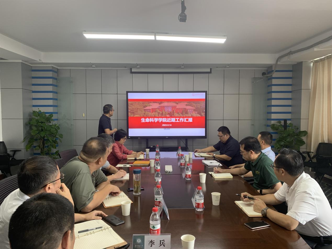 院长邱保胜代表学院向参会人员作学院开学检查工作汇报。邱保胜从学院开展学习贯彻习近平新时代中国特色社会主义思想主题教育情况、学院意识形态工作、师资队伍建设、人才培养中心工作、科学研究与社会服务、一流学科建设,以及新学期重点工作等方面进行汇报。随后,郑宁代表学院全体师生对学校党委近年来给予生科院的大力支持和帮助表示衷心感谢,当前,生科院正处于转型升级、爬坡过坎的发展阶段,学院各项事业发展势头较好,新学期各项工作秩序井然,作为典型的实验学科,还存在经费有限、办学空间紧张、青年人才队伍建设等建设与发展中需要解决的困难与问题。接着,班子成员结合分管工作分别进行了补充汇报,与会的职能部门负责人就有关问题一一回应。