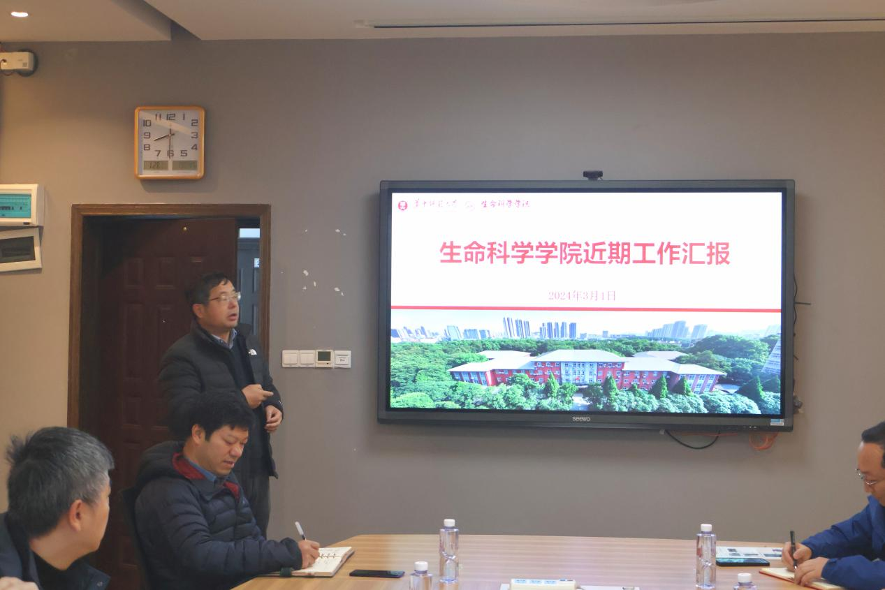 生命科学学院院长邱保胜介绍了学院师生返校情况,寒假期间师生思想动态情况,教学计划的安排与落实情况等开学前的准备工作。接着围绕党建工作、人才培养、队伍建设、科学研究、社会服务、民生时事等汇报了学院的重点工作进展和新学期的发展规划。相关职能部门负责人对学院提出的建议做了回应和指导。