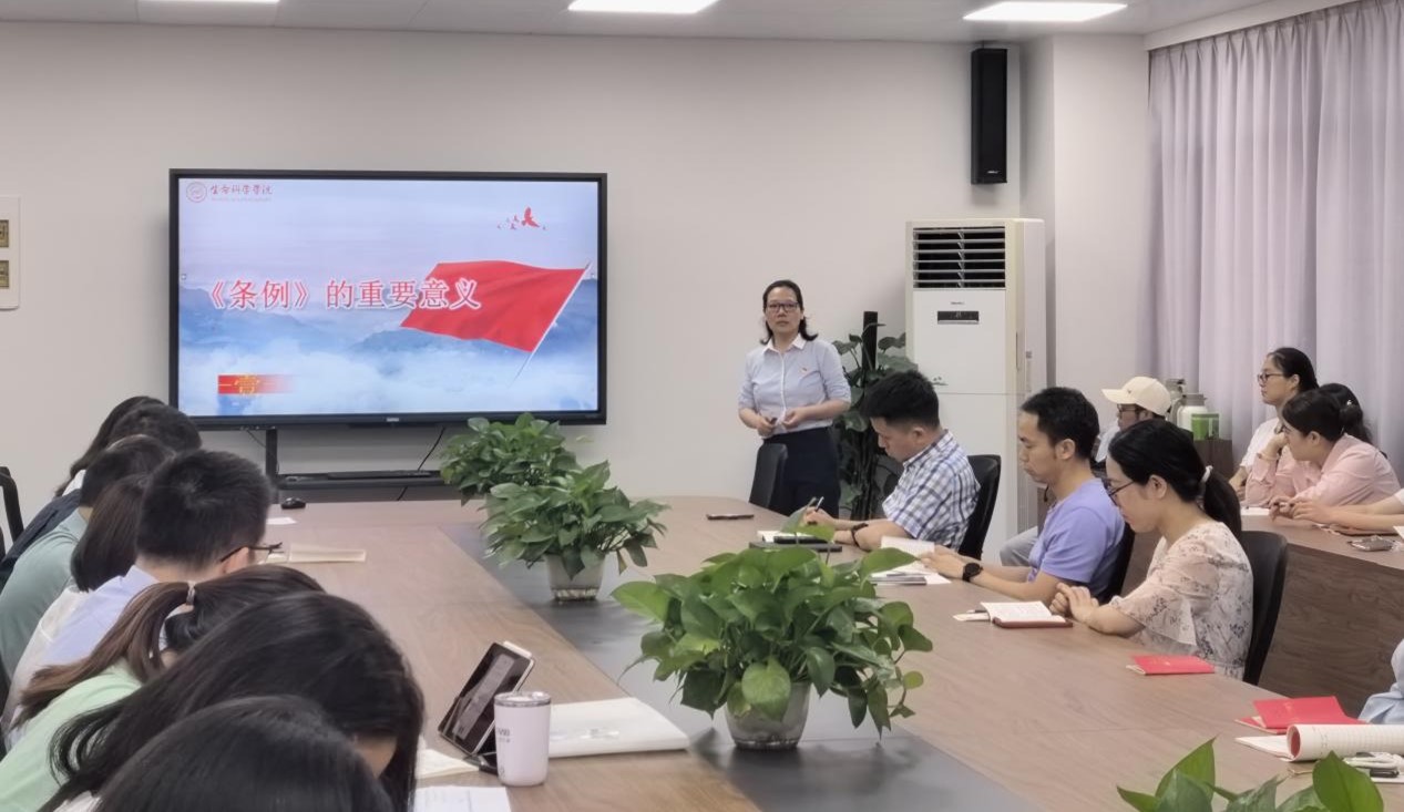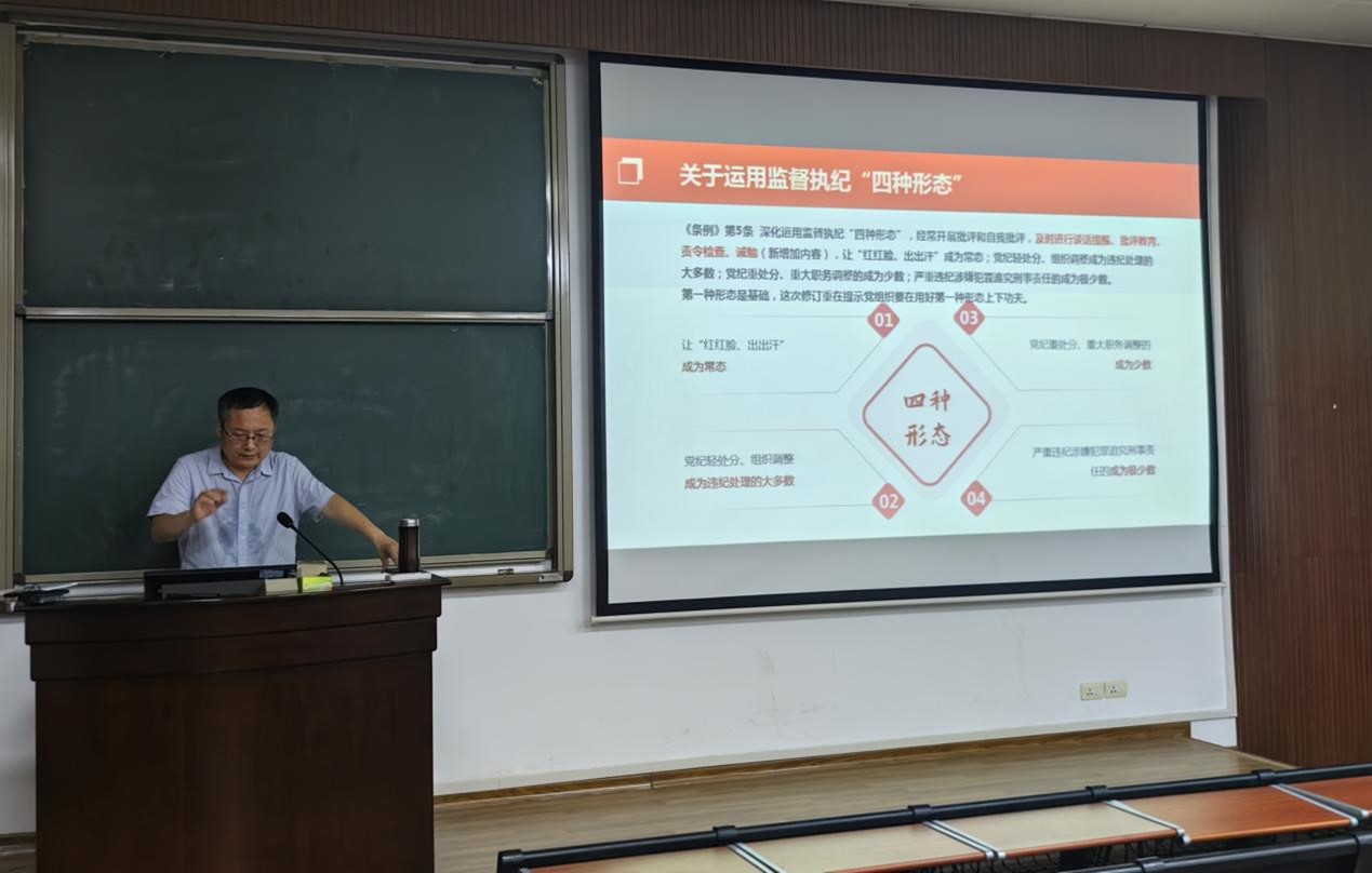 5月31日,院长邱保胜面向教工第三党支部、硕士研究生第二党支部讲授专题党课,主要围绕《条例》历次发布与修订、部分章节学习及如何抓好《条例》学习贯彻展开。邱保胜指出,开展党纪学习教育,是推进党的自我革命、维护党的团结统一的必然要求,各位党员要加强学习,学懂弄通做实,通过多样化学习方式,深化对《条例》的理解和应用。