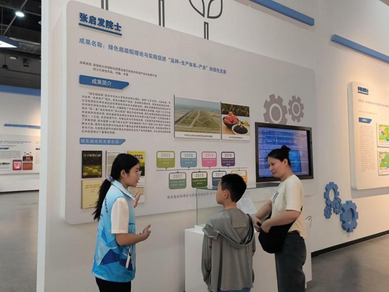 中国工程院院士专家成果展的出口旁,是一面有许多科学家照片的院士墙。宣讲团成员张航在袁隆平院士的照片旁为观众们介绍袁老的生平和理想,在与观众的互动问答当中生动诠释了袁老利农报国的家国情怀、不畏艰难的坚强乐观、富于诗意的追梦人生和心忧天下的使命担当。宣讲团成员王雅婷和董嘉新带领观众们观看院士墙上的照片,用活泼轻快的语言为小观众们介绍了朱有勇院士“比脸还大的马铃薯”和张福锁院士的“科技小院”以及这些科研成果背后的故事。