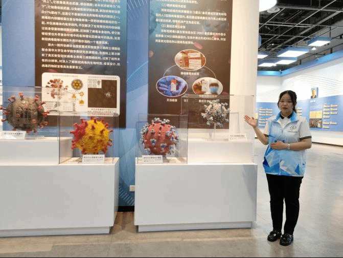 在形象有趣的新冠病毒模型旁,我院宣讲团成员黄敏生动讲解了新冠肺炎的爆发过程以及病毒的三维结构、感染机制和疫苗种类。宣讲团成员金美辰将李兰娟院士团队以生命赴使命、日以继夜研制疫苗的动人故事娓娓道来。结合院士墙上的文字,宣讲团成员冉怡雯将李兰娟院士著名研究成果——李氏人工肝进行了科普讲解。
