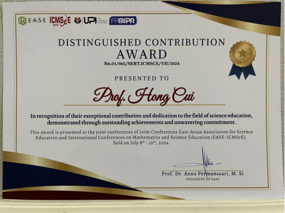 华大生科讯(通讯员 王洪)近日,我院崔鸿教授荣获东亚科学教育学会颁发的“杰出贡献奖”。