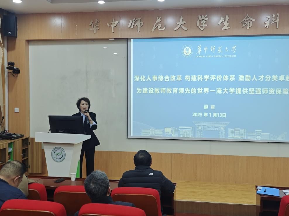 我院邀请人事部部长游丽为全院教职工宣讲教师评价改革系列文件,游部长以《深化人事综合改革、构建科学评价体系、激励人才分类卓越,为建设教师教育领先的世界一流大学提供坚强师资保障》为题,深入阐述党和国家关于深化教育综合改革的总体要求和重点任务,全面解读学校教师评价改革系列文件的出台背景、指导思想、目标任务和修订原则。她强调强国必先强教,强教必先强师,要建设一支聚焦“四个全面”、岗位体系科学完备、分层分类体系完善、教辅人员支撑作用强、成果奖励绩效进一步提升的师资队伍。