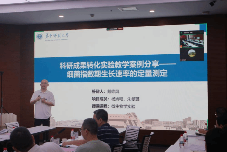 生命科学学院教师代表戴雄风教授作题为《细菌指数期生长速率定量测定》的实验教学改革案例分享。他结合自身科研实际,从案例背景、改革实施和案例应用等方面进行汇报,展示了戴雄风教授团队将高水平科研成果转化为本科生实验教学项目、提高人才培养质量的创新举措。