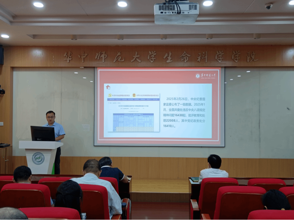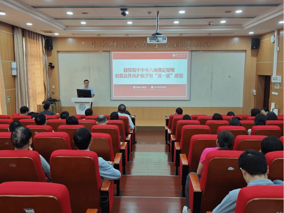 华大生科讯(通讯员 刘诗晴)为深入学习领会习近平总书记关于加强党的作风建设的重要论述,扎实开展深入贯彻中央八项规定精神学习教育,5月28日下午,生命科学学院召开深入贯彻中央八项规定精神学习教育辅导报告会,特别邀请学校中央八项规定及其实施细则精神宣讲团成员李连杰作专题辅导报告。学院全体教职工参会,会议由院党委书记邱保胜主持。