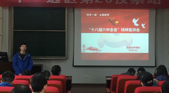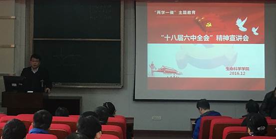 华大生科讯(记者团 彭鑫碧 朱家华)12月2日下午,生科院党委 “两学一做”主题党日活动于5301召开,全体教职工出席会议。会议特邀华中师范大学马克思主义学院李敬煊教授主讲“学习十八届六中全会精神”专题报告,院党委书记邱玉华主持会议。