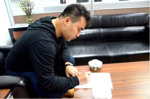 十二点,在热盒饭期间,陆续有学生来找他。先是团委学生会干部前来汇报有关学生工作方面的事情,再是一名11级毕业生询问档案相关事情。最后,还有位15级学生前来请准一些事情。每每要签字时,唐老师都会仔仔细细审查个两三遍,才慎重地下笔。