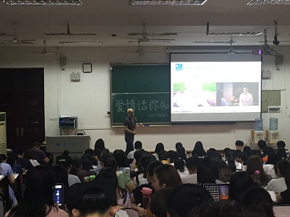 接着,余海军又提出了 “爱情到底是什么?”。《恋爱症候群》的歌词旋律以及视频短片中外国小朋友所给出的童真有趣的回答引得现场同学阵阵欢笑,他指出,小时候描述的爱跟人们理想中的爱比较接近;而长大了以后描述的爱,却越来越偏离了。他还给出了自己对于爱情的定义:“总的来说,爱情是人类的一种情感,这种情感多明确指向为异性或同性,并且有着明确的生理基础,同时也指基于这种情感而产生的亲密的人际关系”。小视频《爱没有标签》也向大家展现了“爱是不分年龄,不分性别,不分种族,不分宗教的”。