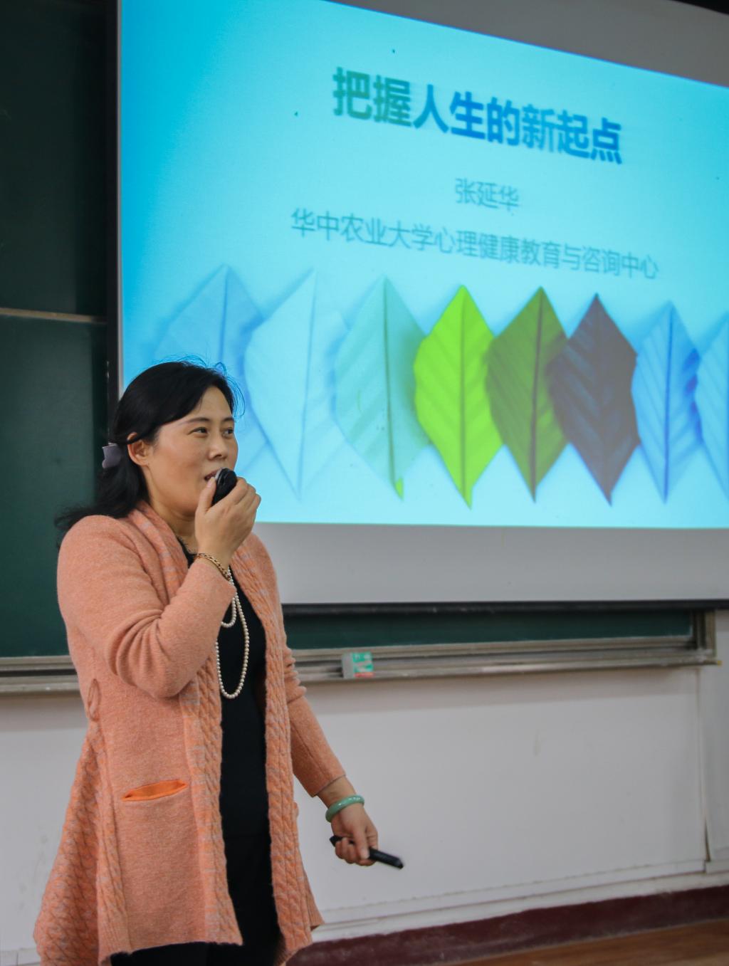 华大生科讯(通讯员 詹乐 罗雁琪 徐畅)11月10日下午,华中农业大学心理健康教育与咨询中心副主任张延华受邀来到我校,在7302教室为我院新生开展了心理适应讲座。此次讲座的主题为“把握人生的新起点”,我校心理健康教育中心于丽霞老师主持。