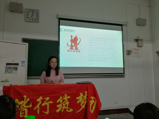 会议伊始,蒋小雪向各位团员讲述了偕行筑梦团的创立以及奉行准则:偕行筑梦团是由生科院2008级本科生杨领创立,以奉行奉献、友爱、互助、进步为准则,致力于“支援教育落后地区教育建设,帮助条件艰苦人们走出困境”的公益事业。从2009成立至今,偕行筑梦团按照预定步骤先后在湖南、贵州、湖北三省进行了暑期支教、基础教育调研等社会实践活动。