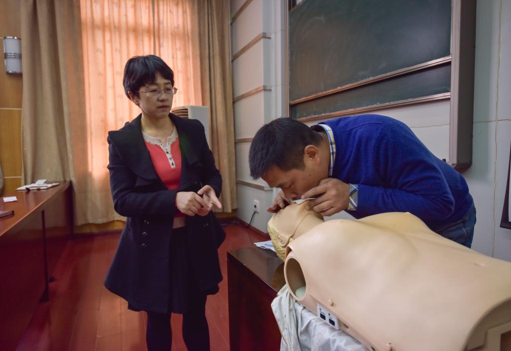 舒化青首先根据三个病例,引出报告主题“心肺复苏术”,阐述了心肺复苏术对我们生命的重要性,她表示心肺复苏术的基本理念就是要尽早、简单、有效,强调“黄金四分钟”是挽救成功的关键因素。接着,舒化青介绍了心肺复苏的发展史,重点讲解了复苏的基本理念和抢救的基本步骤“叫-叫-C-A-B”,并现场邀请老师们做互动演练。最后,邱玉华对舒化青博士的报告表示感谢,并提醒全体教职工要加强锻炼,注意身体健康。