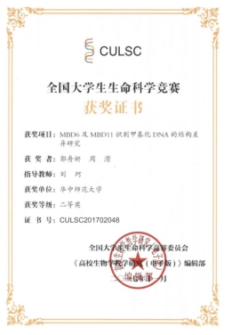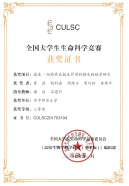本次大赛自2017年4月启动网络报名,共有来自北京大学、复旦大学、浙江大学、中山大学、厦门大学、华中师范大学等全国263所高校的1903个队伍报名参赛。我院参赛的两支队伍在激烈的竞争中脱颖而出,刘珂老师指导的郭舟妍和周滢同学的项目《MBD6及MBD11识别甲基化DNA的结构差异研究》获得全国二等奖,谢波和石遵计老师指导的曹政、胡科鑫、周琦玉、周巧怡和冉炜平同学的项目《藻类—细菌有益相互作用的微生物组学研究》获得全国三等奖。