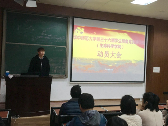 华大生科讯(通讯员 周欣然 令狐昌乾)3月16日中午,华中师范大学第36期学生预备党员培训班生命科学学院动员大会在生科院5401教室举行,参会人员有院党委副书记金新利、本期培训班院带队老师路雨及本期培训班的全体学员。