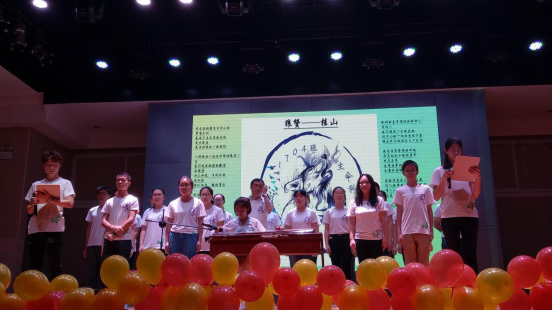 院声乐队带来的《七里香》拉开了此次比赛的序幕,在主持人介绍了具体规则之后,比赛正式开始。第一个参赛班级是1708班,他们通过班级口号“苍茫大地,谁主沉浮,唯我八班,笑傲江湖”与班徽来展示班级形象特色,而后也表演了小提琴片段《犹大,马加比》和歌舞《芳华》。诗朗诵《这也是一切》由1701班全体同学演绎,主讲人伴着原创班歌《夏来有雨莲先绽》,讲解了富有生化班特色的班级简介。1705班则展示了以核酸、飞鸟为主体的班徽,并带来了班级合唱《领舞青春之歌》。接下来的1704班则通过周青春老师与同学们合作表演的诗朗诵《狼赞》,展示班级“狼”文化,也展示出了班级的凝聚力。