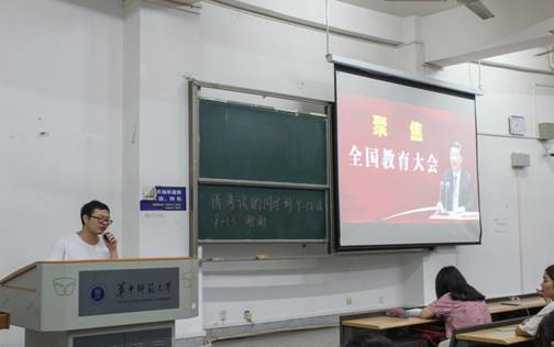 华大生科讯 (通讯员 赵英杰)9月16日晚,我院预备党员赵英杰为2017级同学宣讲全国教育大会精神,针对习近平总书记讲话中关于加强教师队伍建设、全党全社会尊师重教以及深化教育体制改革等内容的学习感受进行分享,并介绍了十八大以来我国教育领域的成绩,使同学们对于会议精神有了一定了解,现场反应热烈。