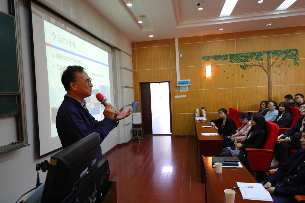 华大生科讯(通讯员 万建)实验室是学院开展教学、科研活动的重要基地,为保证教学、科研活动的正常进行,进一步强化师生安全意识,提升实验室安全管理水平,10月18日上午,我院开展实验室安全教育系列活动,特邀请香港科技大学健康、安全及环境处高级经理杜武俊老师在我院5301报告厅做“危险化学品的使用和管理”安全讲座。讲座由我院党委书记邱玉华主持,生科院及物理学院的相关老师、实验技术人员和研究生共百余人认真听取了讲座。