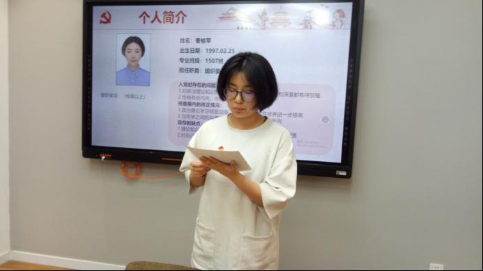 活动伊始,由袁颖敏介绍会议流程,按照党员发展程序,预备党员逐一汇报个人情况,在一年的预备期中,她们严格要求自己,各方面都取得了明显的进步;支委会报告其审查情况,支委会认为两位预备党员符合要求,建议按期转正;其他与会党员对2位预备党员在预备期内各方面的表现逐个进行了充分的讨论;最后经无记名投票表决,由袁颖敏宣读投票结果:一致同意王子媛等2名同志按期转正。
