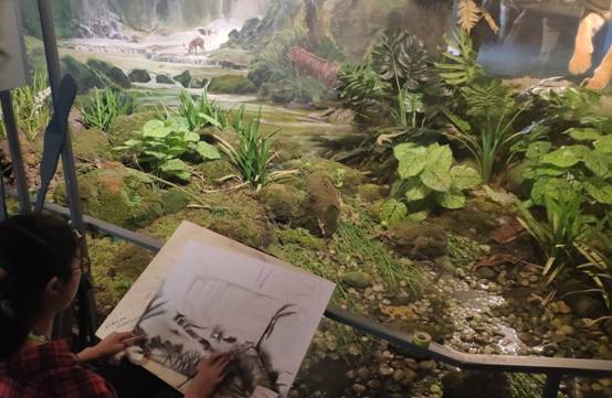 在参观过程中,恰逢由环境健康与教育基金会和中国野生动物保护协会共同主办的环球自然日活动,馆内有许多青少年们面对标本和壁画进行现场绘画,画作栩栩如生。余璇老师从师范生未来发展的角度,提出应该增强师范生艺术修养、开设以生物学为基础的美育课程,培养热爱自然之美的生命情怀。讲解队队员也与周权老师就展馆布置、标本陈列摆放、文化内涵传递等方面展开讨论,对新标本馆的建设充满期望。