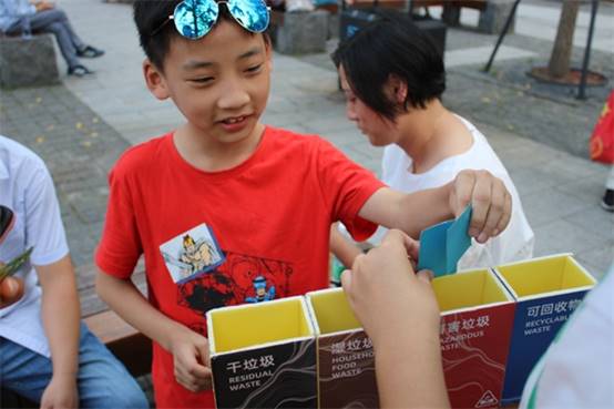 前期准备时,生科群雁团队员利用废弃纸盒制作了分类垃圾桶以及垃圾标签,并准备了具有学院特色的明信片,书签等小礼物。在采访过程中,受访对象随机抽取垃圾标签,将其投入正确的分类垃圾桶。一方面可以了解受访对象对于垃圾分类的学习情况,另一方面也能将科普活动的知识性与趣味性有机结合,用寓教于乐的方式使垃圾分类的知识深入人心。这一科普游戏引起了大多数受访对象的兴趣,尤其是小朋友们积极参与且准确度较高,由此可以看出学校对低年级中小学生的垃圾分类教育十分重视。小朋友们也十分喜爱作为奖励分发的明信片与书签。队员们也希望通过有趣又好玩的方式提高小朋友们的垃圾分类意识,以“小手拉大手”的形式,引导每一个家庭成员丰富垃圾分类的相关知识。