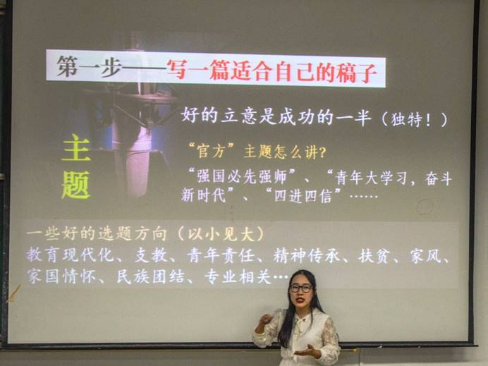 在本次活动中,蔡伟玲从演讲“是什么”、“为什么”、“如何做”三方面为我们生动形象地介绍了演讲的艺术,旨在帮助同学们提升语言表达能力,提升演讲技能,展现自己自信、自强、不断进取的精神面貌。
