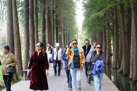 在百万花海公园中,老教师们一边漫步欣赏花海美景,一边亲切交谈,问问近况,聊聊家常,其乐融融。途中,老教师们漫步花海,纷纷与花合影留念。午餐过后,一行人前往同在仙桃市的梦里水乡体验游船之乐、观赏水杉湿地奇景。
