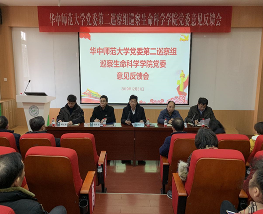 华大生科讯(通讯员:邓淑文)根据学校党委对校内巡察工作的统一安排和部署,2019年12月31日下午,华中师范大学党委第二巡察组巡察生命科学学院党委意见反馈会在5301报告厅举行。校党委副书记、纪委书记陈厚丰,校党委常委、副校长李鸿飞,学校巡察工作办公室主任、第二巡察组组长王旺胜,及第二巡察组全体成员出席会议。学院全体领导班子成员、党委委员、在职教职工、离退休教工代表和学生代表参会。会前,受学校党委委托,巡察组组长王旺胜向学院领导班子反馈了意见,陈厚丰代表学校党委提出了要求。大会上,王旺胜代表学校党委宣读了巡察反馈意见,陈厚丰和李鸿飞对巡察整改工作提出要求。生命科学学院党委书记邱玉华作表态发言,院党委副书记、院长邱保胜主持会议。