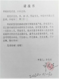 叫表哥有些生疏了,平时我就直接喊他哥,因为他就跟我的亲哥哥一样,从小与我一起长大。他是河南省商丘市第四人民医院神经外科的副主任医师,预备党员。商丘市第四人民医院是商丘市防治新型冠状病毒的定点医院,虽然他所在的神经外科并不属于治疗新型肺炎的科室,但眼见商丘市确诊和疑似病例的数量不断增加,前线医护人员严重不足,他毫不犹疑地于2020年1月30日向院党委、外科党支部递交了请战书,申请加入抗击新冠肺炎的最前线,无论生死,不计报酬,随时待命!一开始,他怕家里人担心,一直没有告诉我们,直到2月5日接到任务之后才跟我们说。后来,他告诉我:医者仁心,我不愿看到患者由于得不到及时的救治而使病情恶化。哥哥是个不善言辞的人,我知道在他简单的话语里饱含了他深深的爱国情怀。我记得他以前跟我说,他很喜欢路遥先生的《平凡的世界》,他敬佩孙少安处理那一摊糟心事时的态度,只要肯拼搏,日子总不会一直是苦的。我想这次他申请去前线,也是想让自己过得平凡而不平庸吧!目前,医院把他派到了收治疑似病人的发热门诊,也许在我写这篇文章时,他正在包裹在密不透气的防护服里紧锣密鼓地对病人进行诊断和治疗。