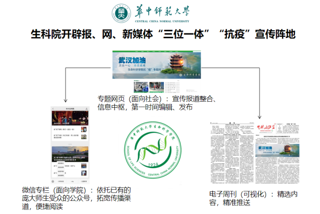 华大生科讯(通讯员 王棣)新型冠状病毒感染的肺炎疫情发生以来,生科院压实二级单位责任,在宣传工作上主动作为,第一时间开辟战“疫”专题网页、微信专栏和电子报刊,将传统媒体与新兴媒体充分结合,构建报、网、新媒体“三位一体”的全媒体宣传阵地,传播战“疫”正能量。