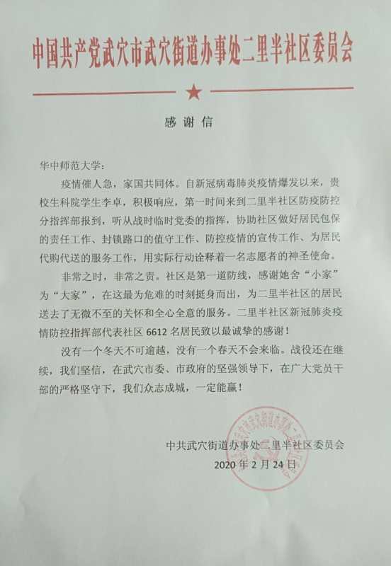 生命科学学院小红楼的收信处静静躺着一封信,这是来自中共武穴街道办事处二里半社区委员会的一封感谢信,字里行间包含的是6612名社区居民对这个00后女孩的认可和感谢。在中国特色社会主义新时代,我们需要这样的精神,期待更多年轻的声音,引领和温暖更多人,在生科,在华师,未来的种子正在成长。