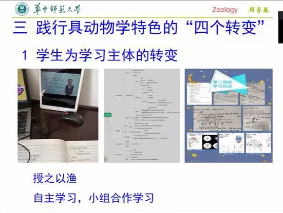 每一位师生都确保在岗在学。为落实“停课不停学”要求,学院学工办按原开学报道时间组织线上晚点名“向华师报到”。教学办及时解决学生的选课、加课、退课问题,保障线上教学如期顺利进行。教师创新线上教学模式,通过云授课模式开展课程教学与指导,通过直播、语音、问答、点评、主题探讨等授课模式,师生互动积极性普遍超过实体课堂。启动生物学国家级虚拟仿真实验教学中心的实验课程资源投入到线上实验教学中,其中国家级项目3项,其余项目60余项。线上教学涌现出《生物学教学技能训练》《动物学》《动物生理学》等学生点赞的网络好课。