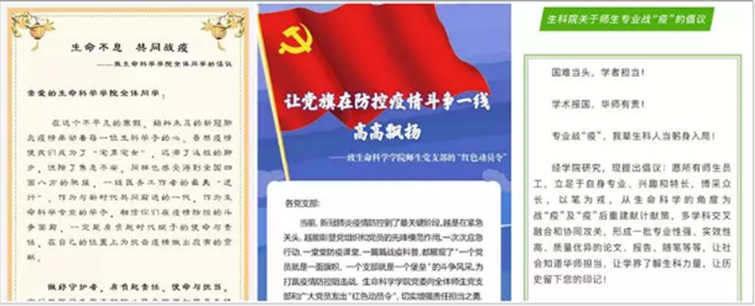 筑牢社会服务战线,坚持打责任战。学院党委把疫情防控作为责任教育、爱国主义教育的鲜活教材,面向全院师生发出《生命不息 共同战疫》《生科院关于师生专业战疫的倡议》,号召广大师生既要写好发表在期刊论文上的文章,也要把论文写在祖国大地上,瞄准国家重大需求开展科学研究,从生命科学的角度为战疫及疫后重建献计献策。战疫一线,党员先行,学院发出《让党旗在疫情防控斗争一线高高飘扬——致生命科学学院师生党支部的“红色动员令”》,教育引导全院师生党员牢记入党誓词,尤其是在困难时期要勇担责任、接受党性历练,积极参与社会服务。