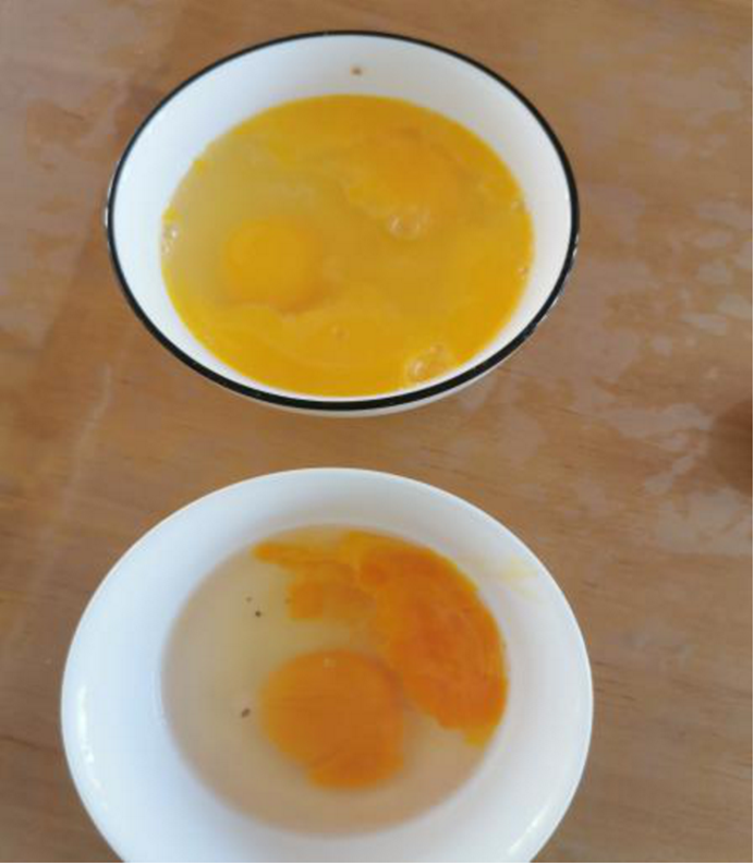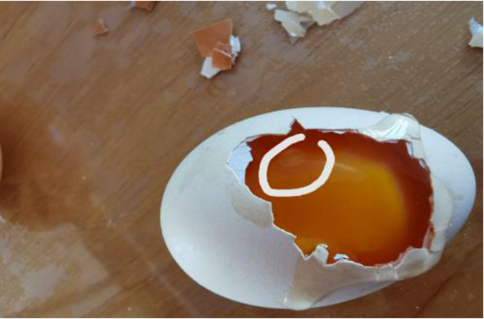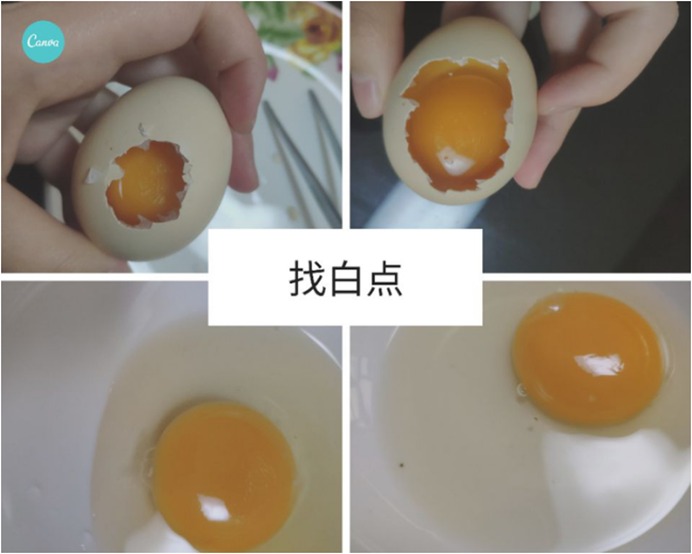 因为是在家里进行实验,实验对象和实验工具很简单。一颗鸡蛋,加上一把镊子或者剪刀。主要现象是在鸡蛋黄上面会有一个白色的圆点,这个圆点是胚盘。用剪刀敲开鸡蛋壳,剥掉硬币大小的鸡蛋壳,轻轻晃动一下,观察蛋黄上是否有白色圆点。很简单的操作,但我一连敲了3个鸡蛋都没有观察到圆点,看到群里其他同学提交的作业照,我着实郁闷啊。不甘心,我又拿了奶奶家的鸡蛋做了实验,这次就观察到了圆点,很神奇呦。(纠错OS:无论是否受精都会有小圆点,没有小圆点的可能说明胚盘发育不完整哦~)