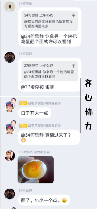 第一次网上实验课还挺有趣,先是老师带领我们复习所学知识和观看了玻片和标本图示,后来自己打鸡蛋做实验时摇晃了几下才找到小白点,这节课之前我一直以为我们吃的都是未受精的鸡蛋呢,颠覆了我们的认识哈哈哈