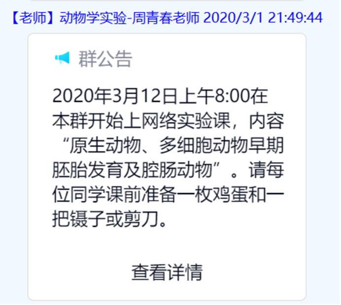 华大生科讯(通讯员 刘家瑜)因为新冠病毒疫情迟迟不能开学的华中师范大学生科学子们,已经进行了近五周的网上学习了。对于实践性极强的生物科学,专业实验课必不可少。虽然我们很期盼,但实验课怎么能在线上呢?不想前几天我收到通知将在3月12日开始在线上《动物学实验》课!还让我们准备一枚鸡蛋?我带着满心的疑惑加进了《动物学实验》网络课堂。