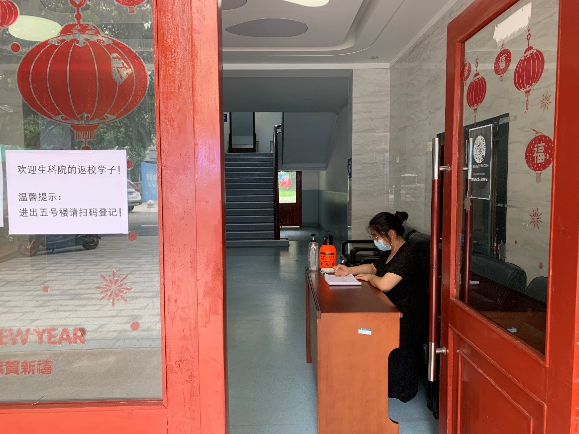 (即日启动战时状态,安排一线教职工志愿者在学院门口值班,进出师生扫码、测温,图为实验员张迪值班,守好学院“安全门”)