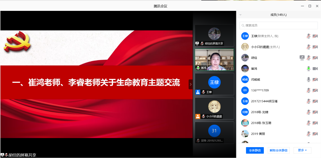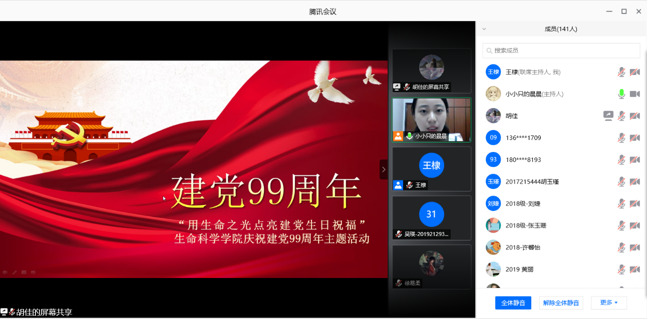华大生科讯(通讯员:张子悦)为热烈庆祝建党99周年,我院于6月30日晚19点开展“用生命之光点亮建党生日祝福”主题教育活动。此次教育活动由本科生第四党支部党员黄晨主持,邀请了我院党委委员、华中师范大学本科教学创新奖一等奖获得者崔鸿老师、李睿老师,和学生党员、发展对象及入党积极分子,共同探讨生命教育、传承生科精神,以庆祝建党99周年为契机加强党性教育,以课程育人新理念着力构建育人大格局。