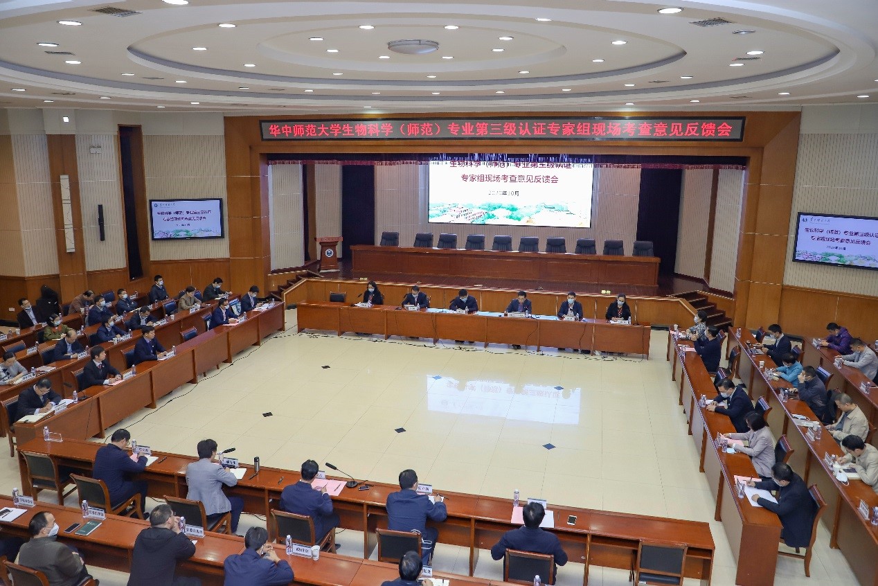 10月28日,生物科学师范专业第三级认证专家组现场考查意见反馈会在科学会堂报告厅举行。专家组组长邓洪平代表专家组介绍了现场考查的基本情况,认可了生物科学师范专业在重视程度方面、目标定位方面、师资队伍方面、课程结果方面和师范生质量方面的突出表现。随后,专家组围绕三级认证指标,逐一点评反馈,并就毕业要求、合作与实践、支撑条件、质量保障、课程与教学、师资队伍、学生发展等方面提出了中肯的意见和可行的建议。