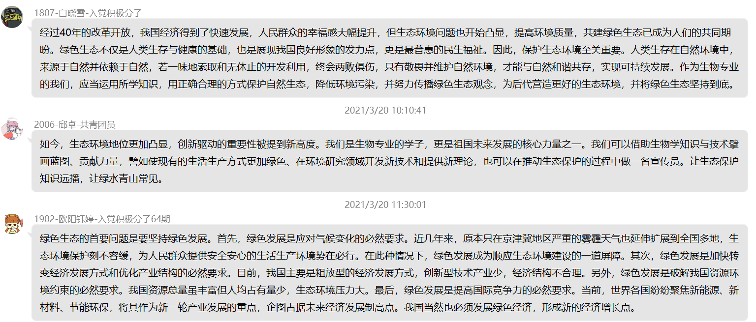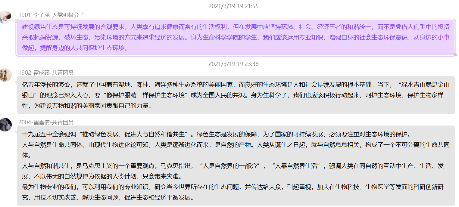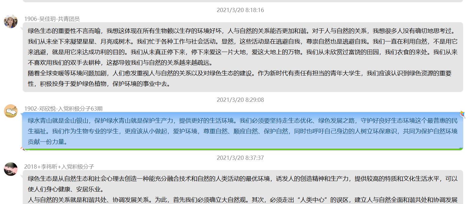 本次讨论围绕作为新时代青年的我们对绿色生态重要性及人与自然关系的探讨,并分享了作为生物专业的我们推动绿色发展,促进人与自然和谐共生的方式方法。