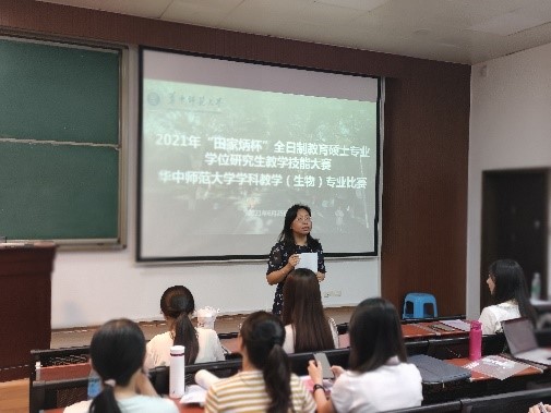 (通讯员:阎晓飞)为进一步强化教育硕士实践能力的培养,同时选拔优秀研究生参与全国大赛,生命科学学院于6月25日下午在生科院5401举办了全日制教育硕士教学技能大赛暨“田家炳杯”学科教学(生物)专业全日制教育硕士教学技能大赛预选赛。本次比赛由李娟老师主持,并邀请了武汉市江岸区生物学教研员向德平老师,武汉市洪山区生物学教研员陈莹老师和武汉市五一劳动奖获得者、武汉市教师五项全能比赛一等奖获得者、武汉市常青第一中学汪琴老师三位老师担任评委。