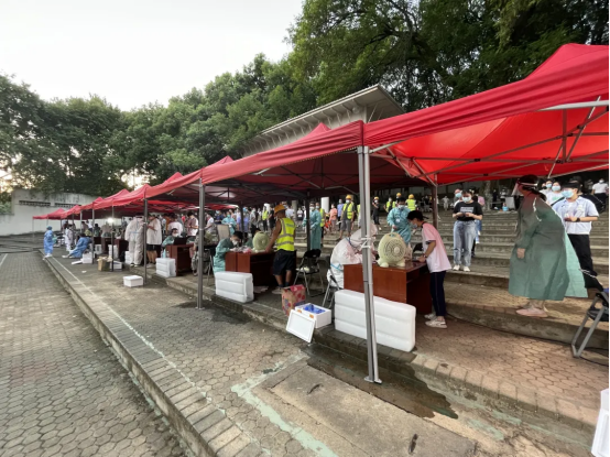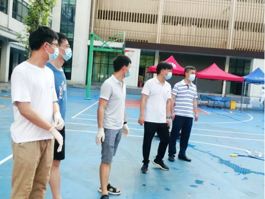 在北区华师附小核酸检测点,院党委书记郑宁、副书记刘阳到场指导工作,并对志愿者们的工作表示了肯定和支持,关心叮嘱师生同时做好自身安全防护工作。在东区学子篮球场核酸检测点,我院核酸检测志愿队和“送清凉”志愿队两支队伍奋力在一线,共同帮助医护人员做好现场核酸检测工作。