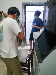 志愿服务队立即行动,院党委副书记刘阳带领师生来到学院制冰室,为活动做充分的前期物资准备。在实验中心李兵主任和胡原、龚思颖老师的指导和帮助下,志愿者们有序地将制好的冰块备好分别装进泡沫箱中,运输送往各检测点。