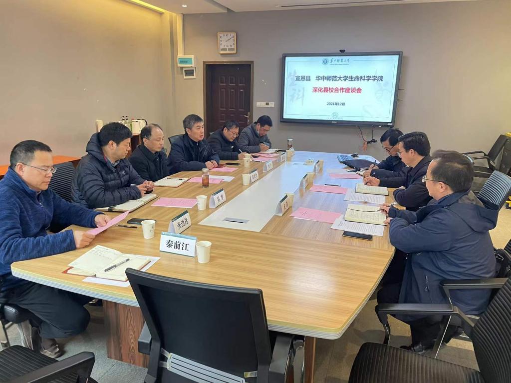 12月24日,宣恩县政协副主席胡晓洪、华中师范大学驻宣恩县椒园镇三河沟村乡村振兴工作队队长兼第一书记范重庆、宣恩县对口帮扶办公室负责人尤浩一行三人来院洽谈县校合作。国家杰出青年基金获得者黄双全教授、院党委书记郑宁、副院长吴华、副院长谢波、实验中心主任李兵、张洪茂教授等参与并开展座谈交流。座谈会由郑宁主持。
