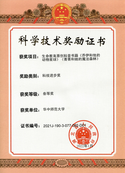 华大生科讯 (通讯员:文/王雅婷)近日,2021年度湖北省科学技术奖励揭晓,我院王欣老师所在团队荣获科学技术进步奖三等奖。其获奖项目为生命教育原创科普书籍《乔伊和他的动物星球》《菁菁和她的魔法森林》。