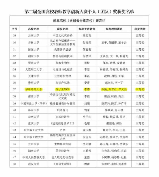 华大生科讯 (通讯员 董依然)近日,第二届全国高校教师教学创新大赛落下帷幕,我院以李睿为主讲教师,罗勤、万翠红、许文亮组成的参赛教师团队主讲“分子生物学”课程荣获部属高校正高组三等奖。