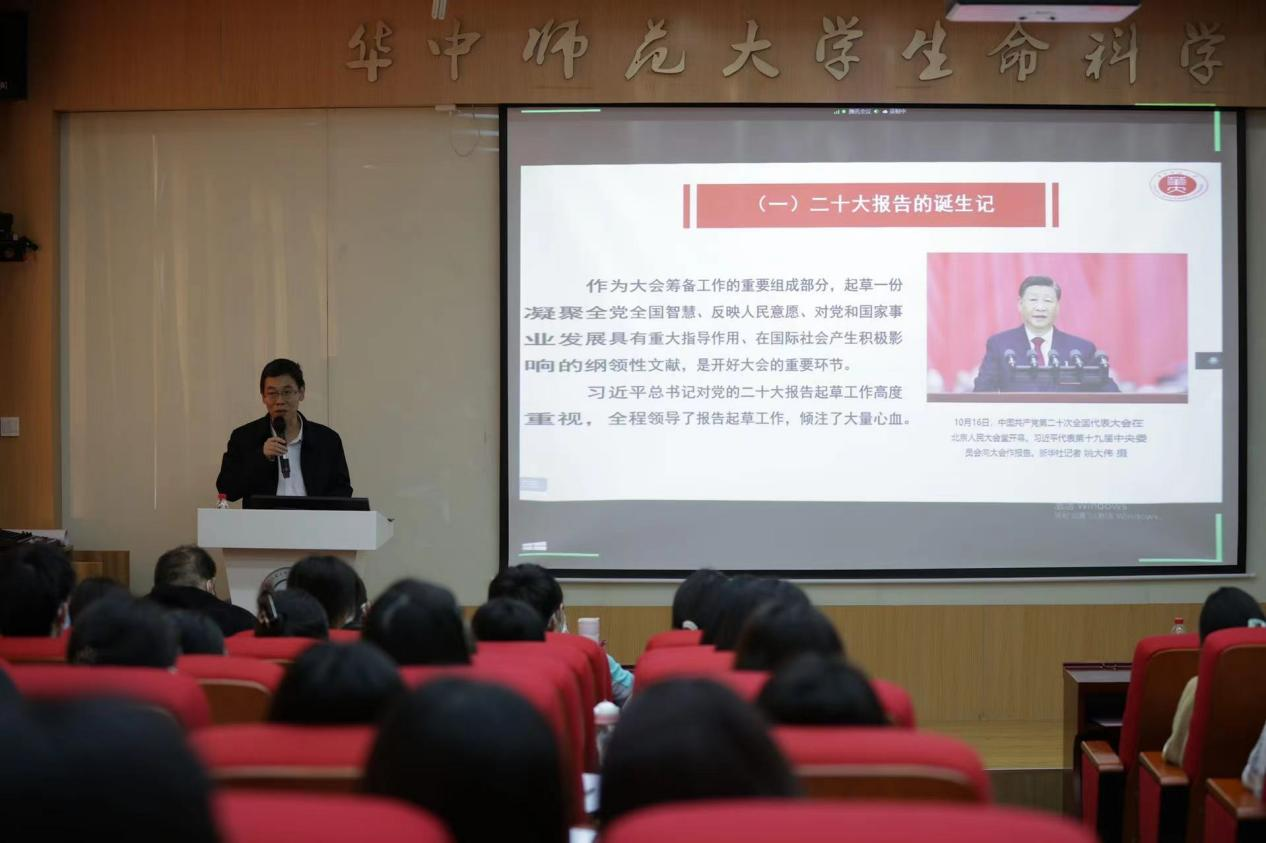 华大生科讯(通讯员:刘琴、覃川哲、曾思蕾;摄影:周权)11月12日上午十点,副校长李鸿飞在生命科学学院5301报告厅面向基层学院青年学生开展党的二十大精神巡讲,主题为《新坐标,新征程,新梦想,新青年——学习贯彻党的二十大精神》。生命科学学院、城市与环境学院、音乐学院、公共管理学院第十期党员发展对象培训班全体学员和四个学院的党委书记、副书记到场参加学习。
