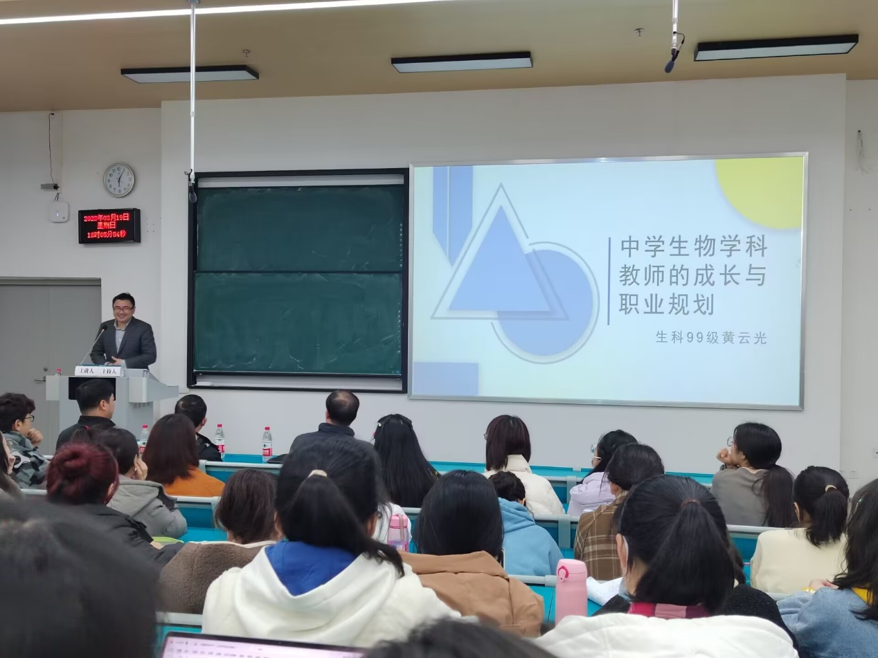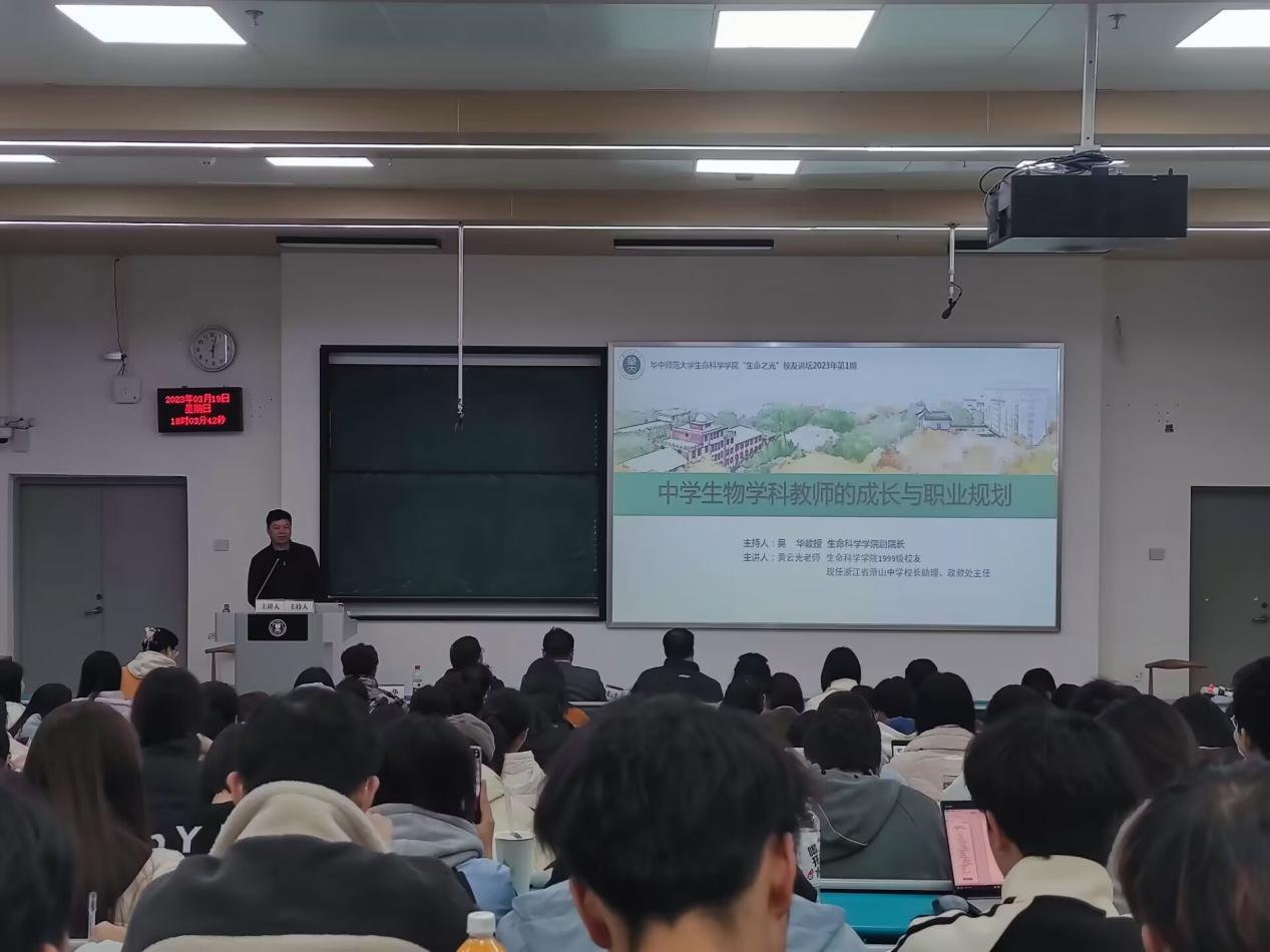 华大生科讯(通讯员冯玉果)为了增强学院师范生自我规划意识,拓宽职业认知视野,提升专业综合素养,3月19日16:00,生命科学学院“生命之光”校友讲坛2023年第1期“中学生物学科教师的成长与职业规划”主题讲座在8106教室进行。生命科学学院副院长吴华教授、班主任艾辉副教授,辅导员余璇及近150名师范生参加了本次讲座。本次讲座由优秀校友、现任浙江省萧山中学校长助理的黄云光老师主讲,吴华教授主持。