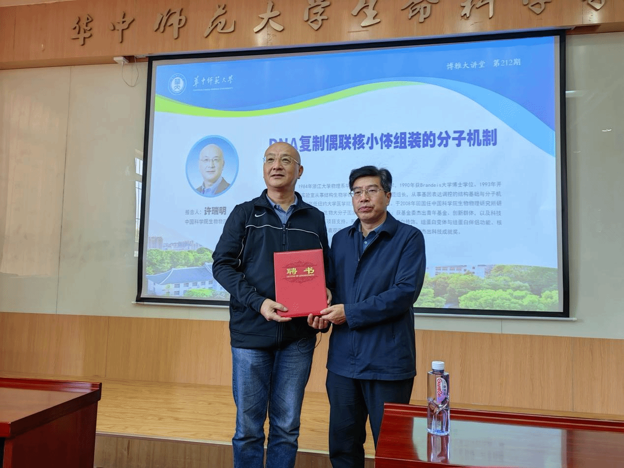 华大生科讯(通讯员:冯肇雪)10月8日上午,中国科学院生物物理研究所研究员、博士生导师、国家“杰出青年”获得者,美国科学促进会会士许瑞明做客华中师范大学第212期“博雅大讲堂”,在生命科学学院五号楼三楼学术报告厅L301为我校师生做了题为“DNA复制偶联小体组装的分子机制”的报告。华中师范大学副校长彭双阶为许瑞明研究员颁发了第212期“博雅大讲堂”主讲人聘书。报告由党委书记郑宁主持,本科生院、生命科学学院等单位负责人和相关院系师生到场聆听。